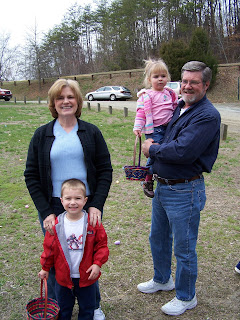 Mom, Dad and I took the kids to the Easter egg hunt. The Easter Bunny was there. M insisted that she wanted to pick up the pink eggs. J & M had their pics taken with the Easter bunny. They had fun, but it bothers me that PARENTS get so competitive at these hunts. Older siblings and moms and dads were picking up the eggs and throwing them in their kids' baskets. You could hear parents frantically yelling for their kids to run to a different spot and quickly get eggs. I realize that the parents simply wanted the kids to get some eggs, but because of all the adult interference the eggs were gone in about two minutes. Sometimes I wish adults could just get out of the way and let kids have fun. There was also a little boy at the hunt with a walker. It broke my heart. M asked why he had the walker and I explained that it helped him walk. What I could NOT explain was why this little boy needed help walking.